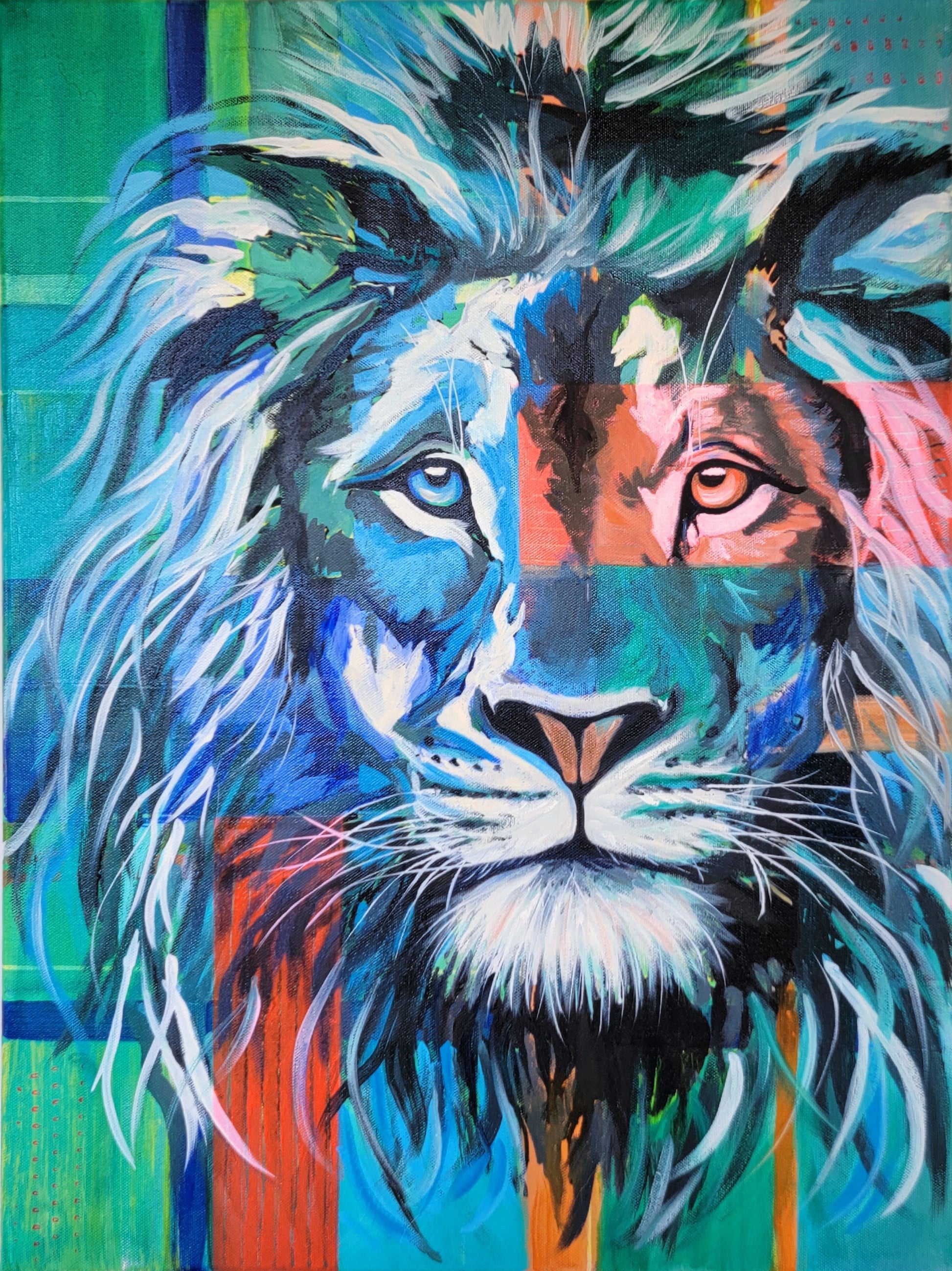 This unique painting of a stylized lion, with piercing gaze, symbolizes courage, strength, and a profound connection with nature.