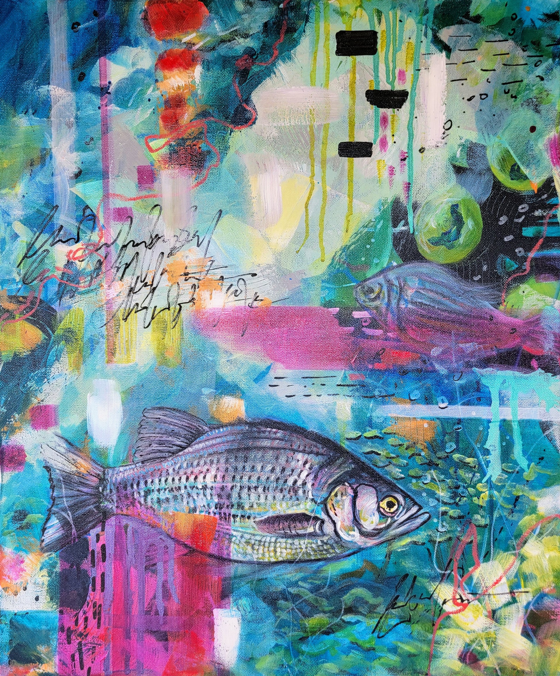 The painting celebrates the vibrant spirit of this prized fish, symbolizing Oklahoma's aquatic ecosystem and its natural rhythms. As the White Bass thrives in its native waters with elegance and precision, it reminds us of the importance of preserving and cherishing our state's rich natural heritage.