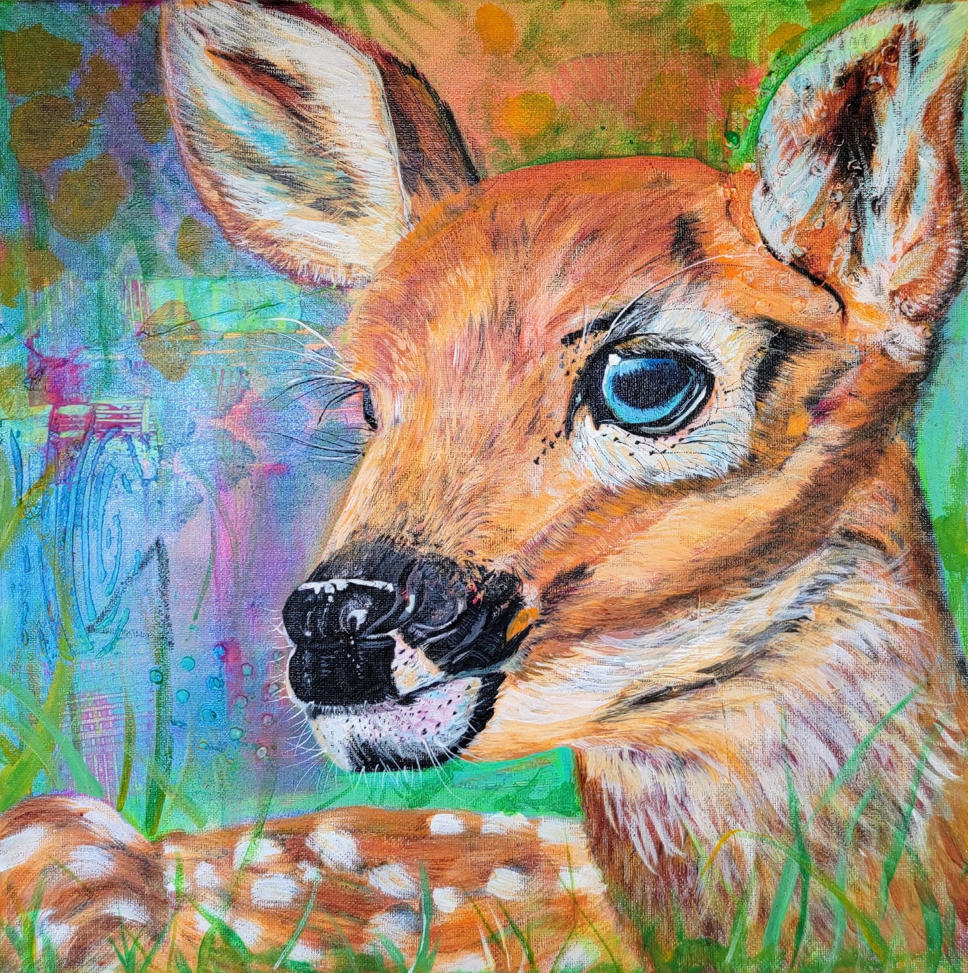 This adorable baby deer with its innocent eyes is a perfect addition to any kid's room, sparking imagination and love for wildlife. Let this charming painting bring joy and delight, as they embrace their woodland friend and embark on imaginative adventures in the magical forest. The fawn's gentle presence reminds them of the harmony in nature, igniting wonder and appreciation for the beauty around them.